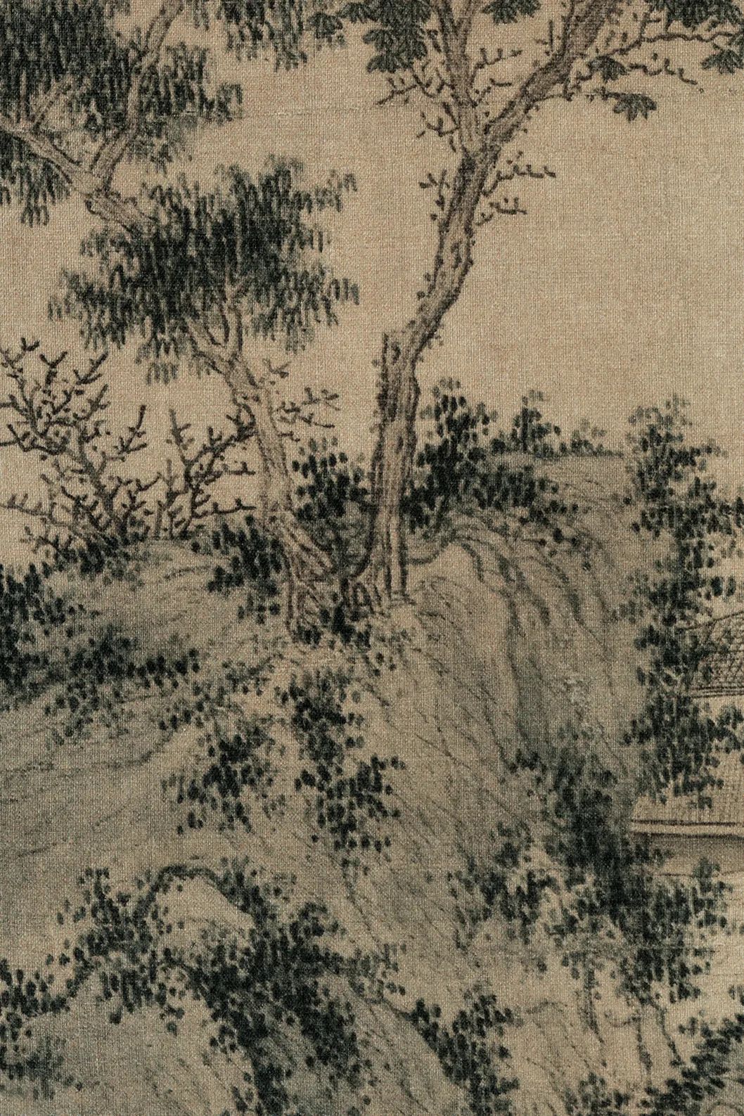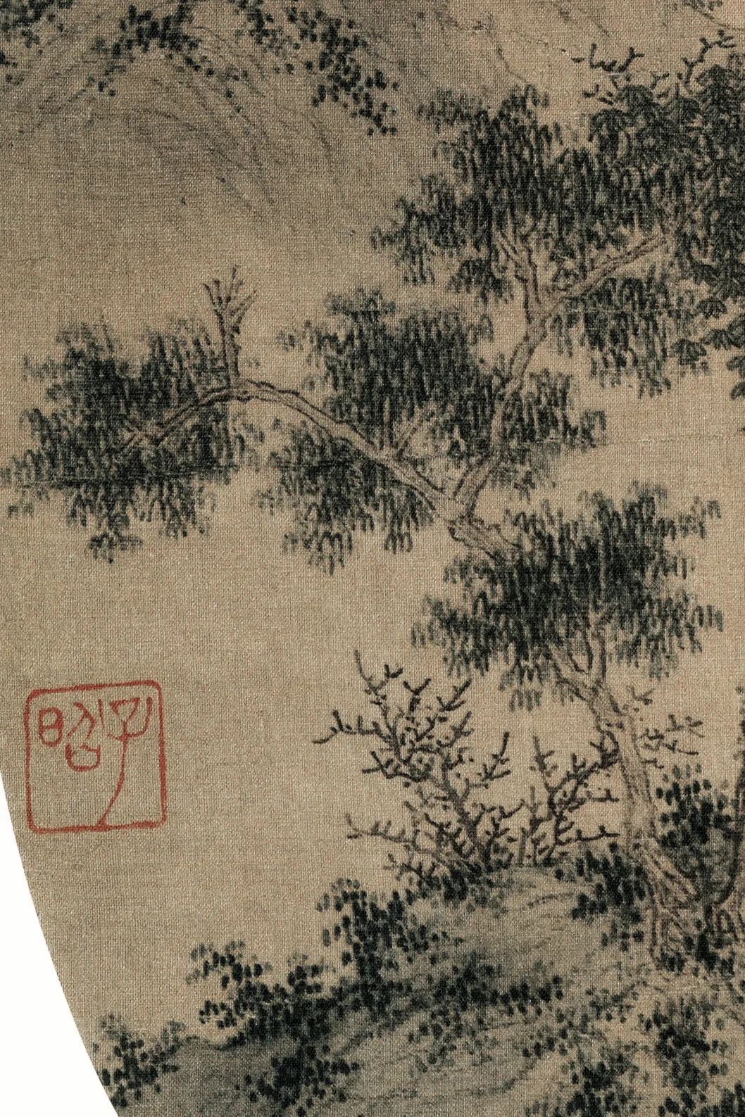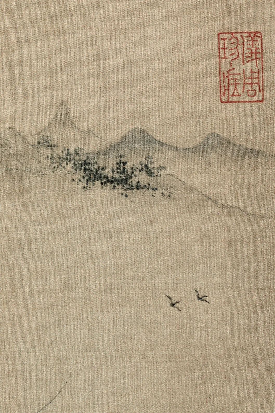 盛懋以“三远法”打破线性透视,将秋溪的时空压缩于方寸之间。近景山石以解索皴勾勒,苔点如胡椒散落,暗示秋日的萧瑟;中景渔艇与垂钓翁构成视觉焦点,翁身微侧,目光追随飞鸿远去,形成“人-舟-鸟”的动态三角;远景山峦隐于云雾,仅以淡墨晕染轮廓,与近景形成虚实对照。这种空间折叠,使画面既有“可游可居”的实境感,又充满“咫尺千里”的诗意想象。