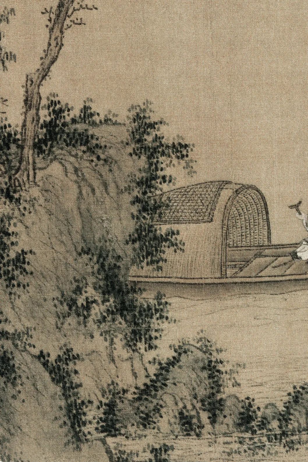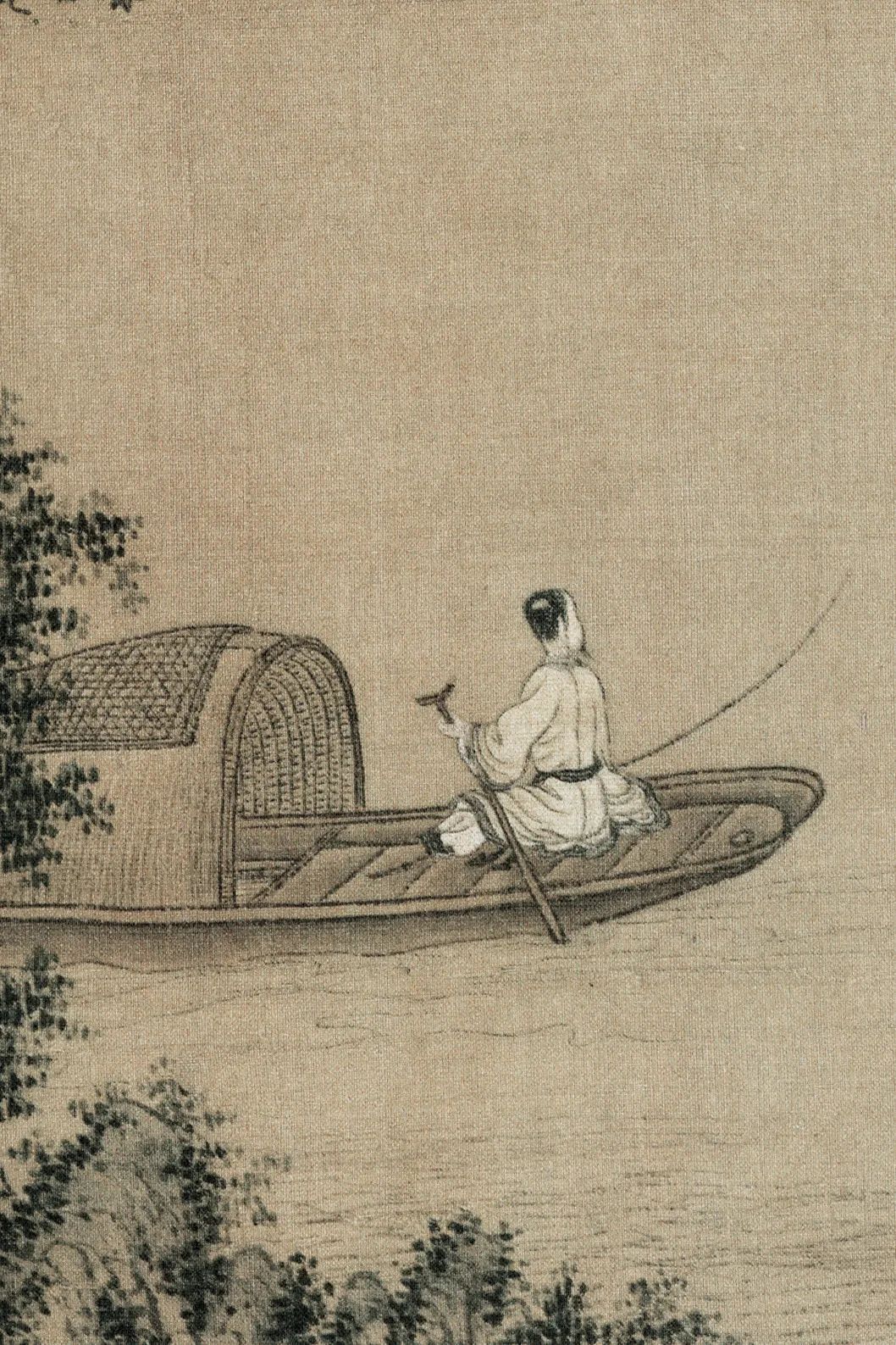 盛懋的笔墨兼具院体画的工整与文人画的逸气。山石以披麻皴为主,线条圆润流畅,设色以赭石、花青为主,淡雅中透出世俗的烟火气;渔艇与人物则以高古游丝描勾勒,衣纹如行云流水,赋予画面灵动之感。这种“工写结合”的技法,既满足士大夫阶层的审美趣味,又贴近普通民众的欣赏习惯,使《秋溪钓艇图》成为雅俗共赏的典范。